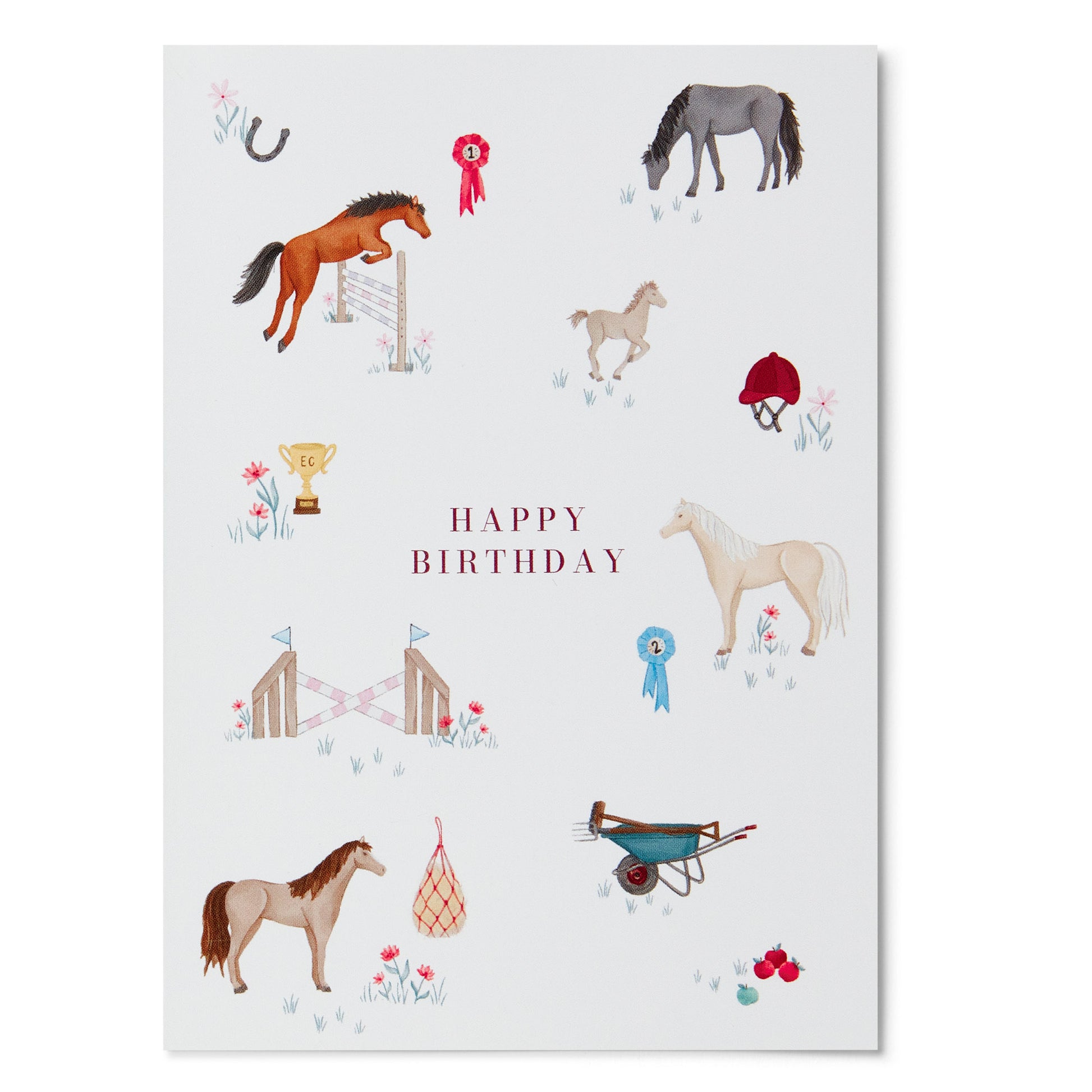 Featuring a graceful palomino, a bay horse mid-jump, a playful foal, riding hat, wheelbarrow, colourful rosettes, and the signature Eleanor Charles trophy, this card is perfect for pony lovers big or small.