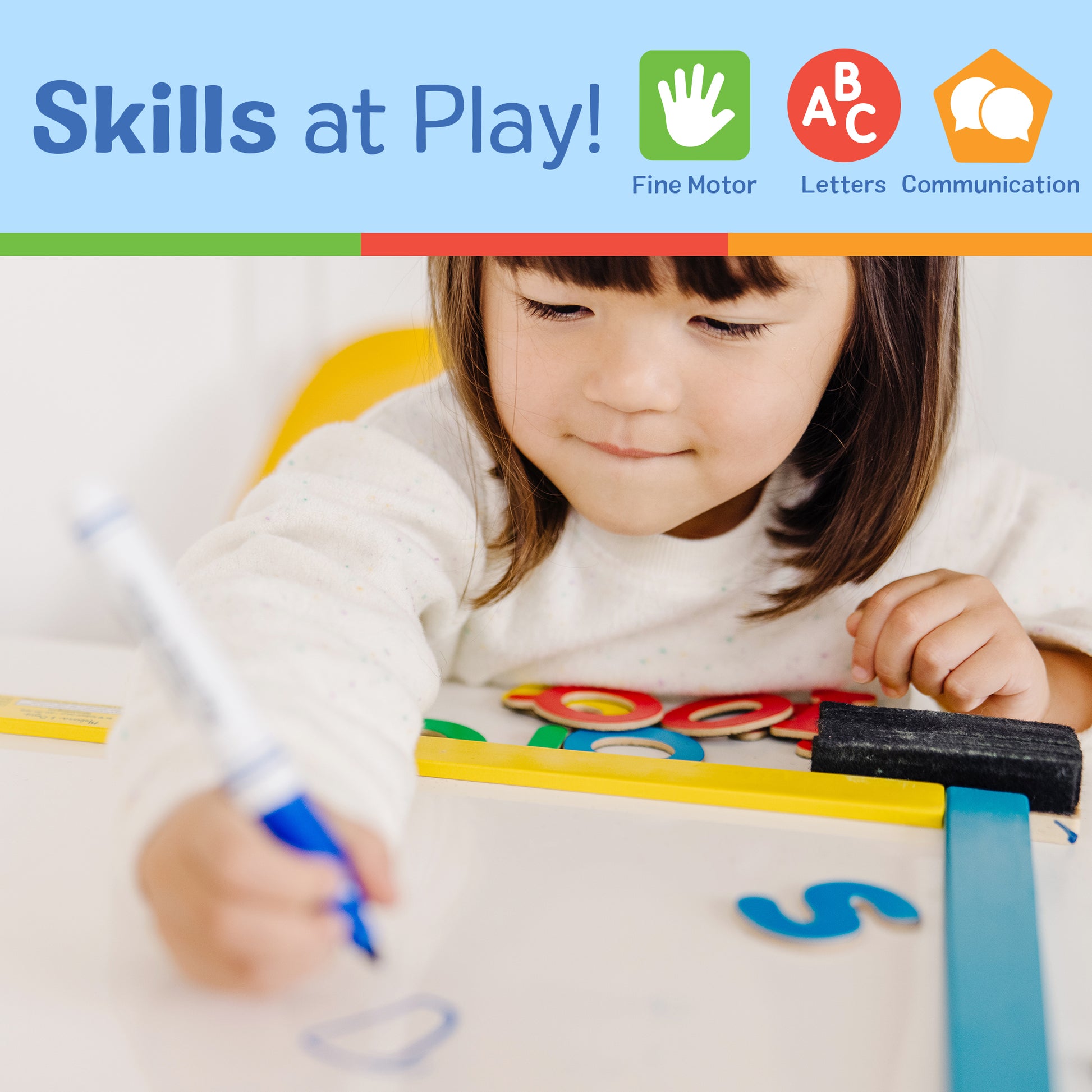The double-Sided Magnetic Board offers endless fun! One side is a chalkboard, the other a dry-erase board, with included chalk, marker, eraser, and 36 magnetic letters and numbers.