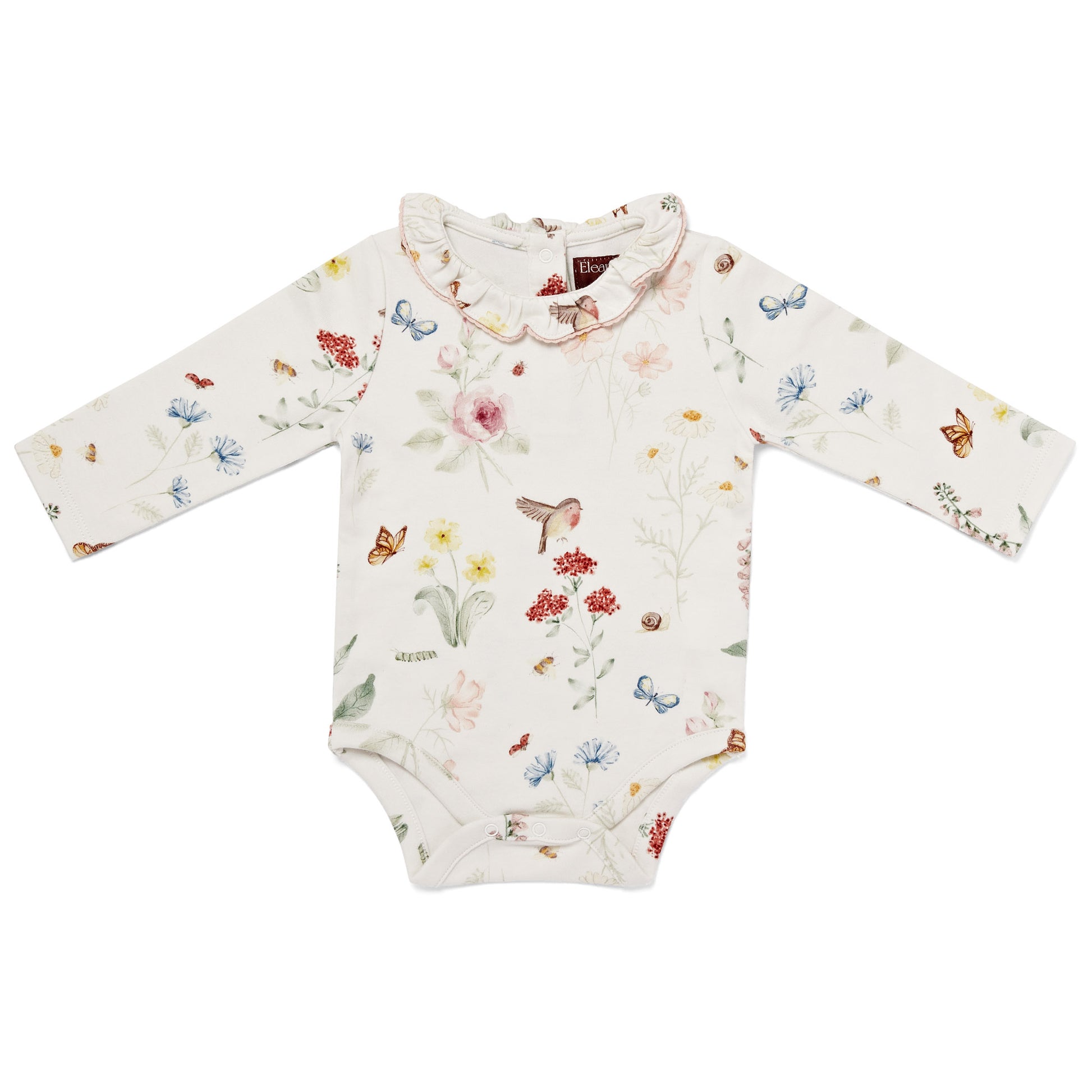This sweet bodysuit features an all-over garden print with delicate illustrations of a caterpillar, snail, butterfly, bee, and flowers — a whimsical design inspired by the quiet magic of nature. A soft frill collar adds an elegant touch, perfect for layering or wearing as a statement piece on its own.