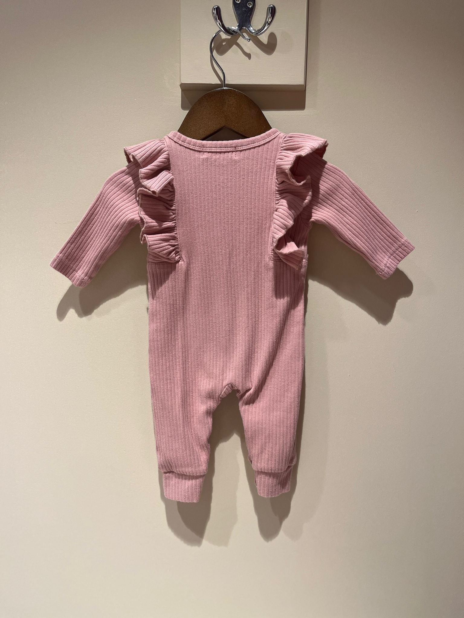 Second hand organic cotton frill bodysuit in blush pink, size 0-3 months.