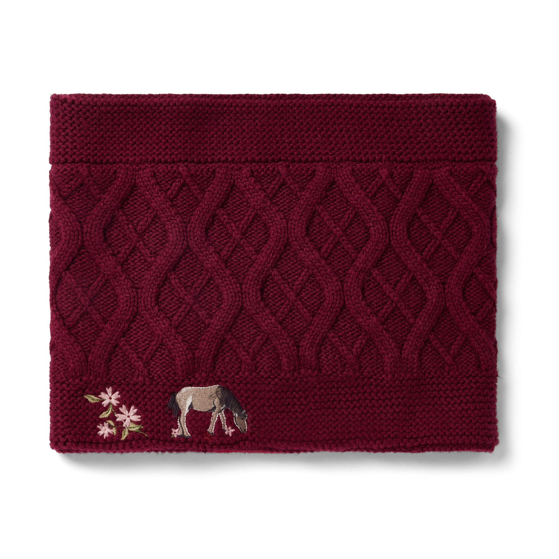 Wrap up in warmth and timeless style with this beautifully crafted burgundy snood. Featuring a rich cable-knit design and a luxuriously soft fleece lining, this cold-weather essential offers comfort that lasts all season. A charming embroidered detail near the hem—a grazing horse surrounded by delicate pink flowers—adds a whimsical, nature-inspired touch that sets it apart. Perfect for layering on chilly days, this snood brings together function, warmth, and personality in one cosy piece.