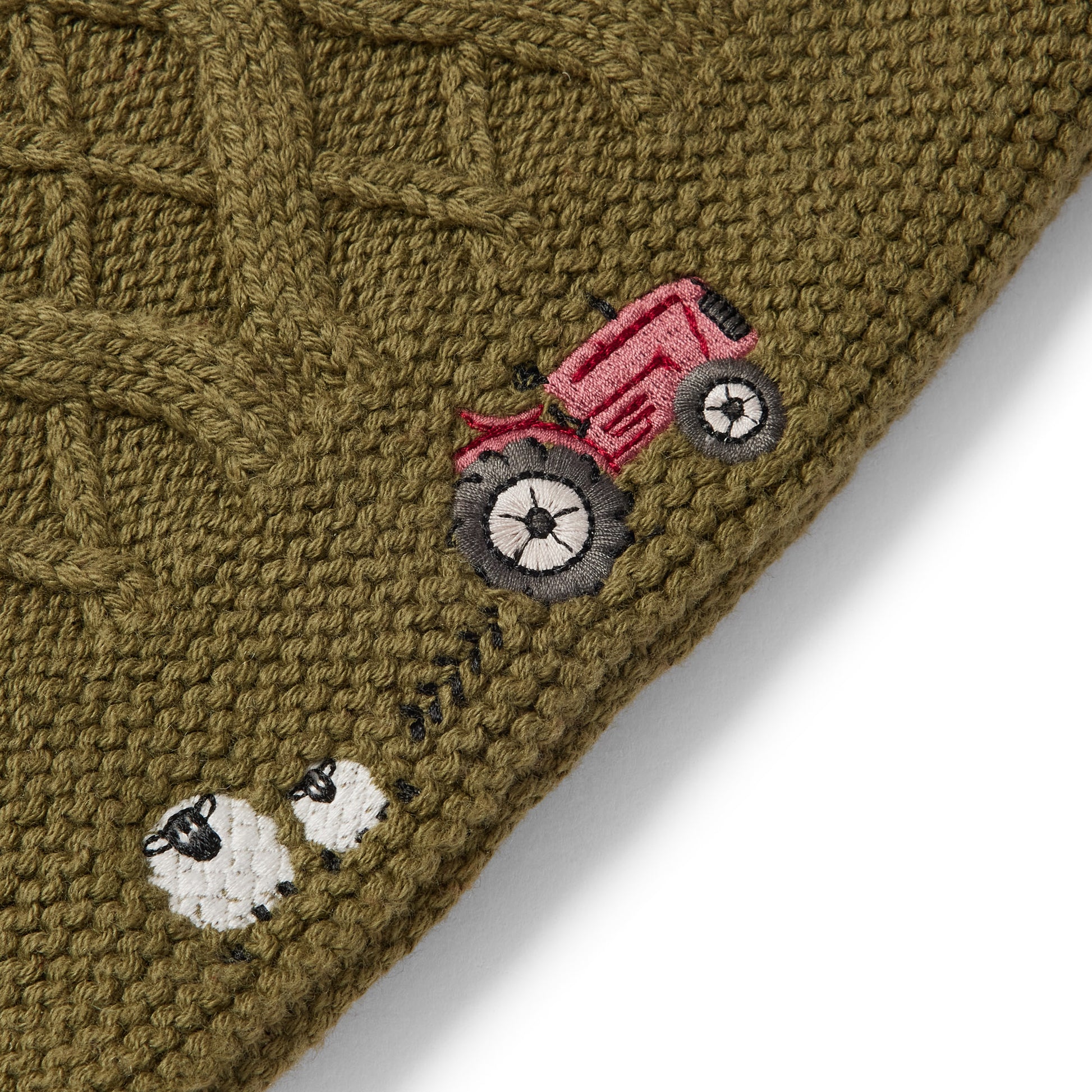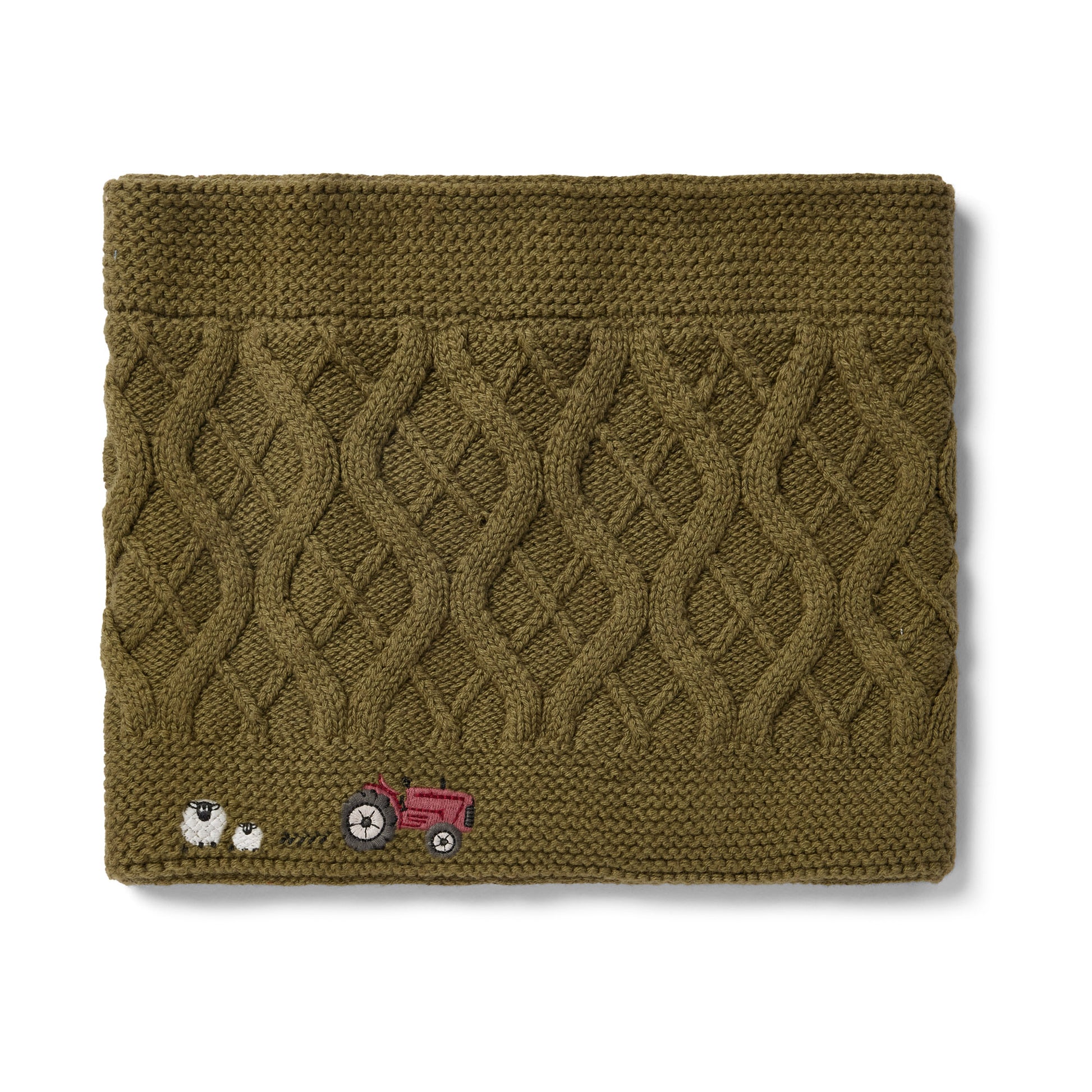 Keep little necks warm and snug with our On the Farm Fleece-Lined Cable Knit Snood. Knitted in a rich khaki green with a timeless diamond cable pattern, this cosy accessory is fully lined with soft fleece for extra warmth on chilly days. The charming farmyard embroidery – a bright red tractor leading a fluffy white sheep – adds a playful country touch.