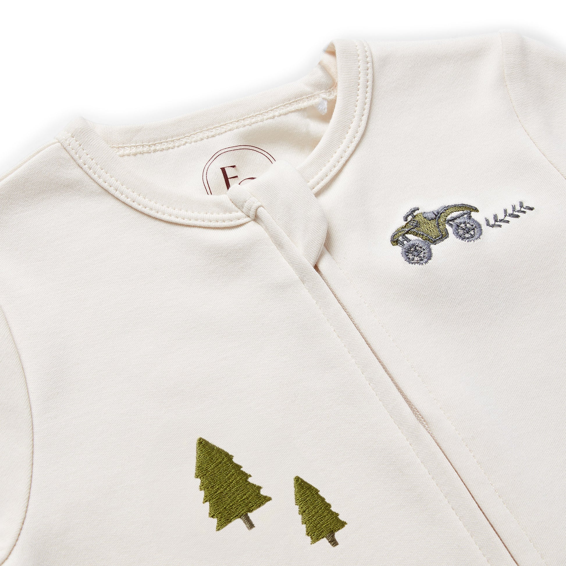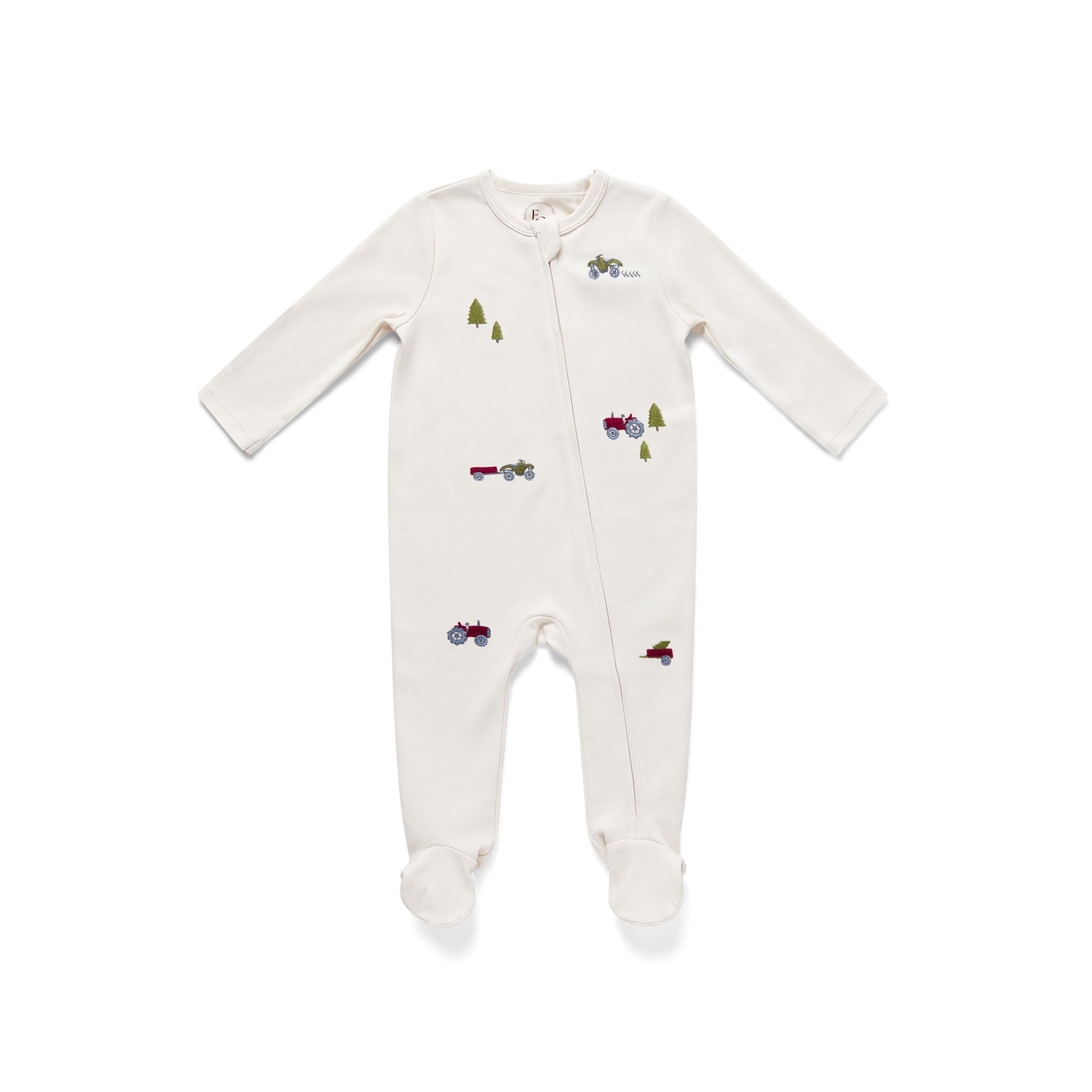 Featuring charming embroidered tractors, trailers, and pine trees across a warm off-white base, this footed sleepsuit blends playful detail with timeless style.