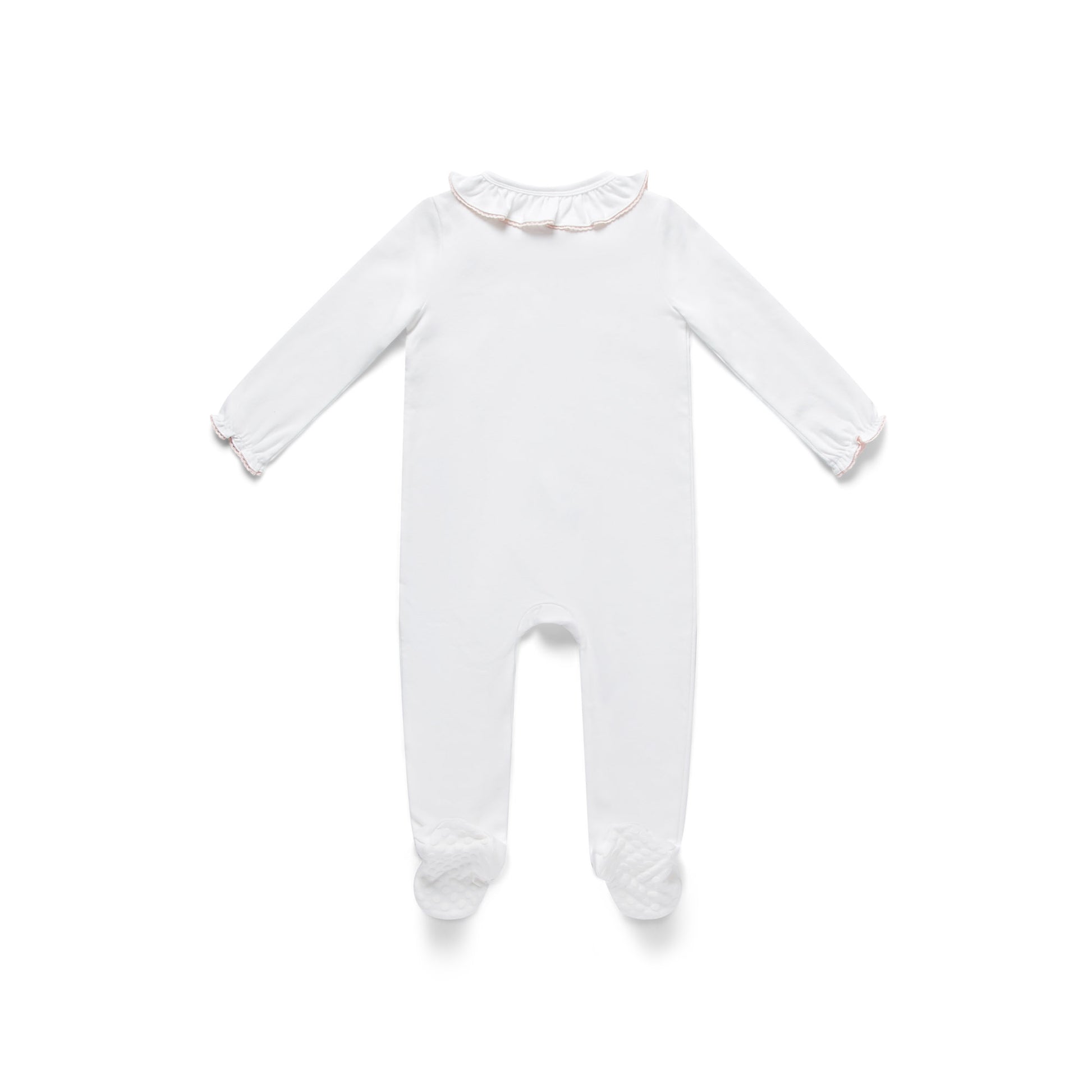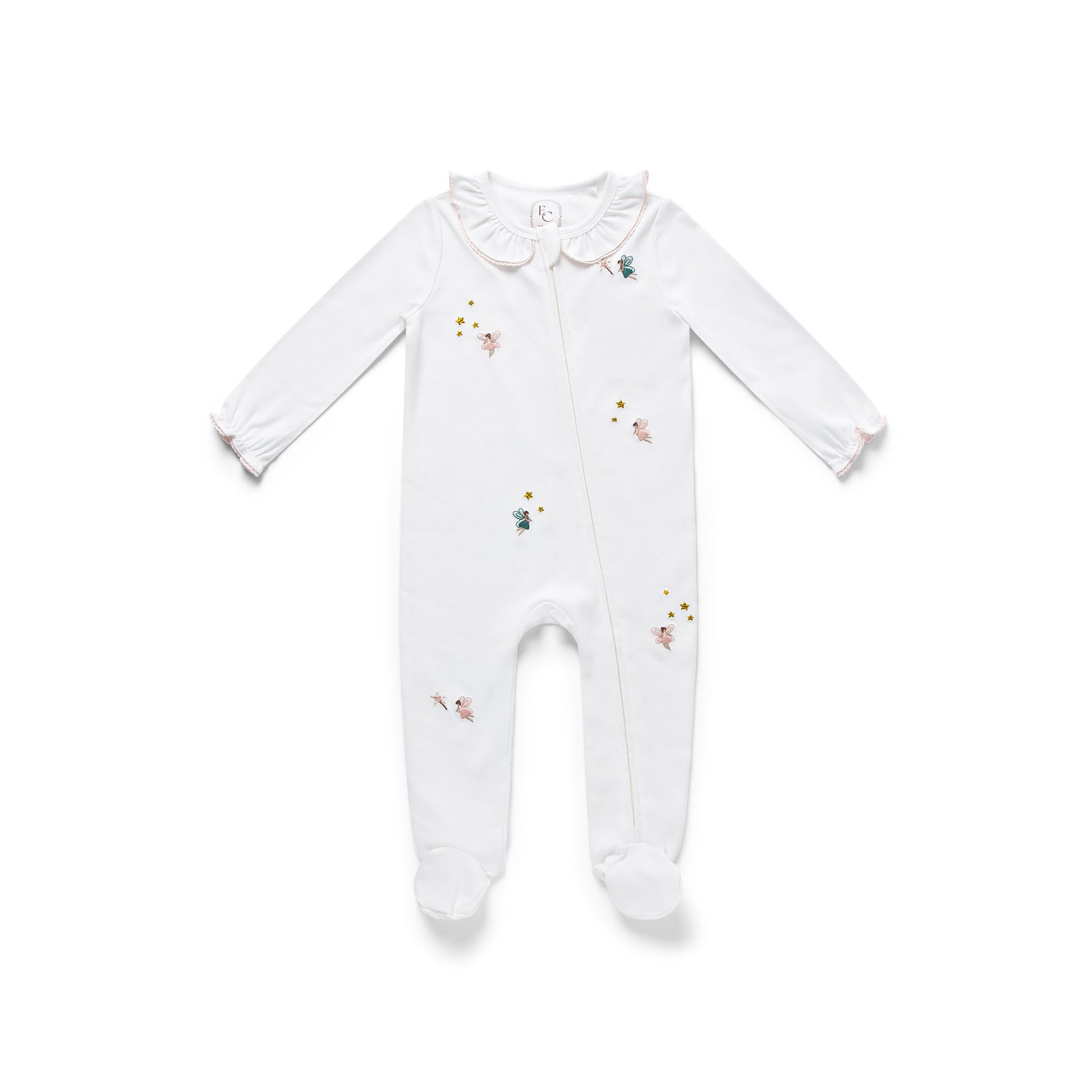 Adorned with beautifully embroidered fairies and twinkling stars, this charming design features a classic white base with a delicate pink scalloped trim on the collar and cuffs. A practical concealed zip fastening makes for easy nighttime changes, while enclosed feet keep tiny toes cosy.